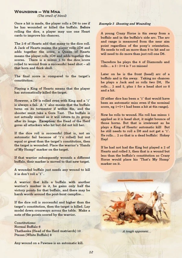 The game uses a ‘rolling road’ mechanism where the buffalo models stay still on the table and everything else - hunters, fallen buffalo, areas of prairie dog holes (where many a pony breaks a leg) – move relative to the herd. Contact with a buffalo can be… messy.
